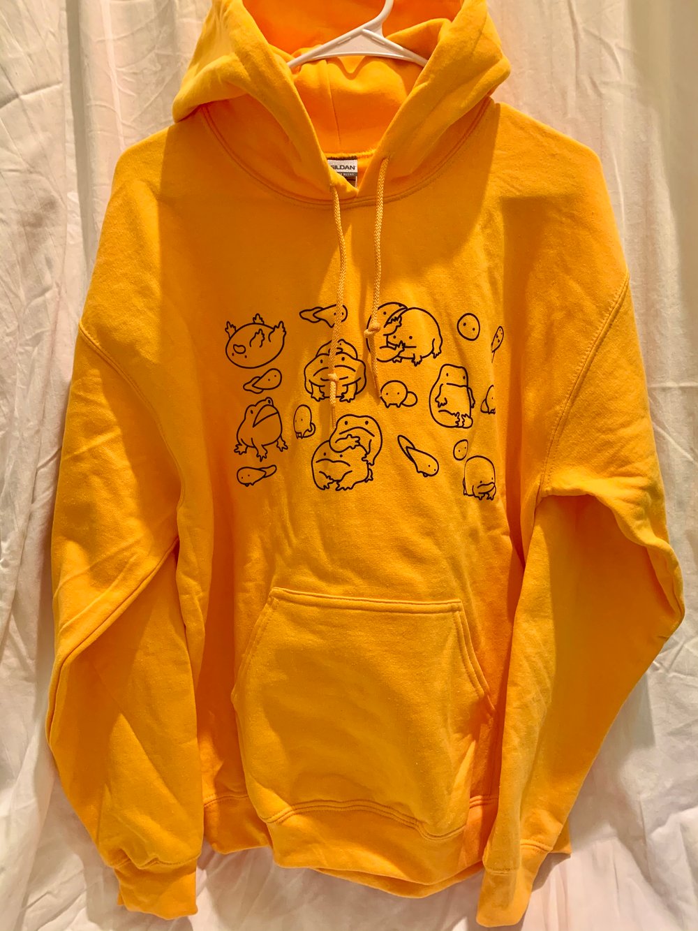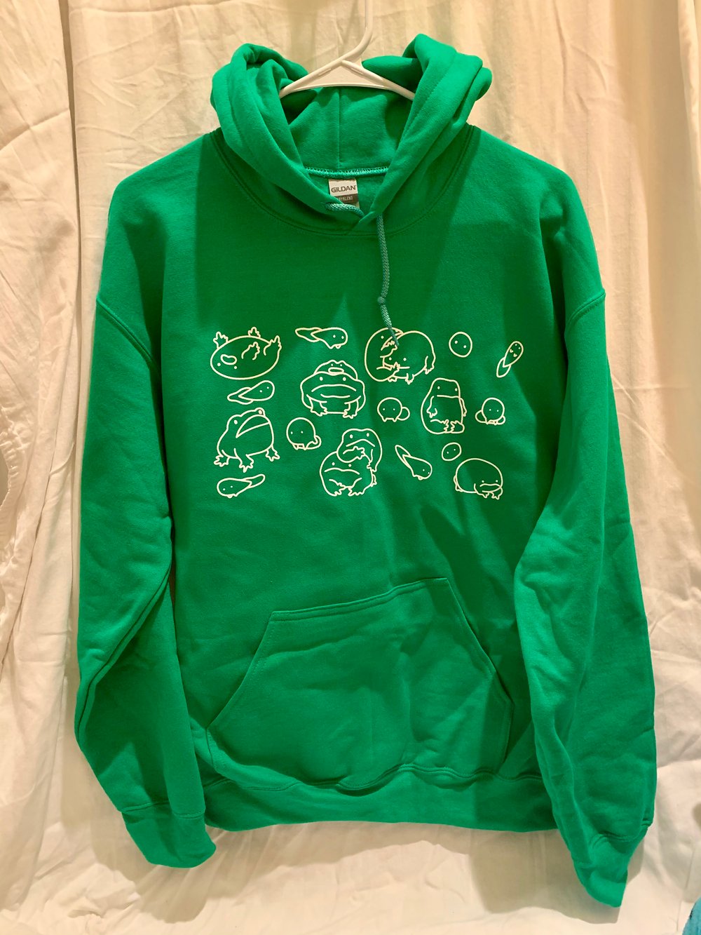 Woah those are a lot of frogs. What are they doing? Gibby's throwing a frog part and you are invited on this soft cotton hoodie!